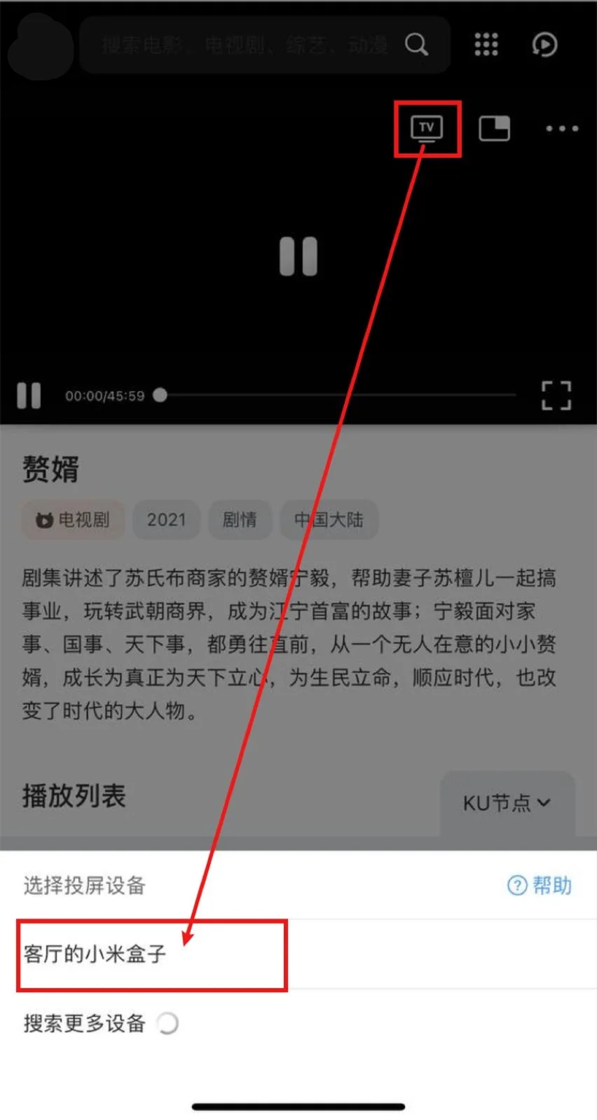 打开夸克浏览器->打开联合网视->播放视频->选择·····右上角 … ->投屏->等待搜寻出智能电视/电视盒子->选中,即可投屏。