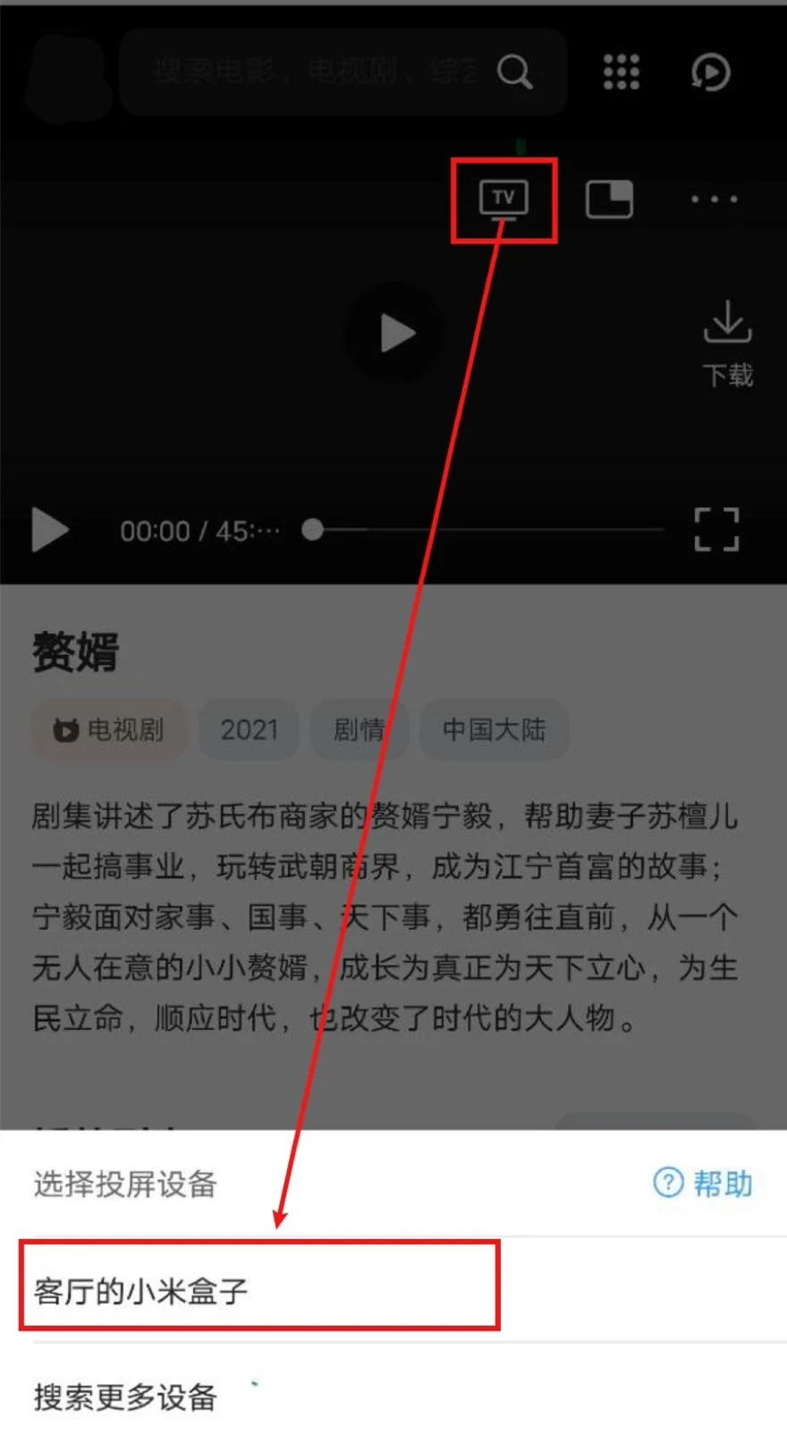 打开QQ浏览器(会接管网页播放器)->打开联合网视->播放视频->选中投屏图标->等待搜寻出智能电视/电视盒子->选中,即可投屏。