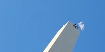 ccc阿根廷夺得了世界杯冠军进行夺冠游行时,一名球迷坐在67米的方尖碑顶部的窗口挥舞阿根廷国旗收起