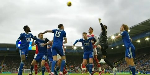VAR回放本怀特的犯规,拉住了莱斯特城门将的手