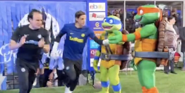 国米球员穿上与赞助商派拉蒙联动的忍者神龟球衣,并在赛前入场环节与达芬奇、米开朗基罗击掌收起