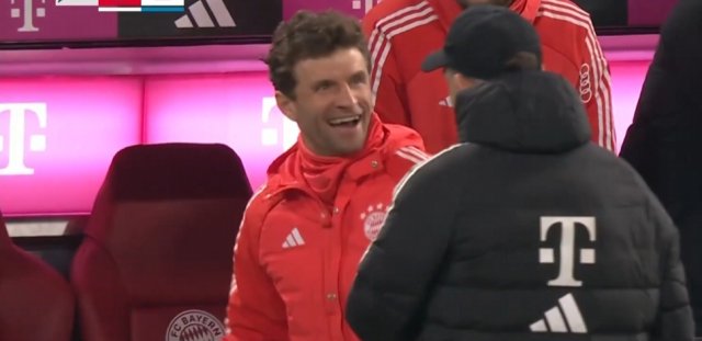 看到凯恩绝杀后,穆勒与图赫尔在场边喜笑颜开