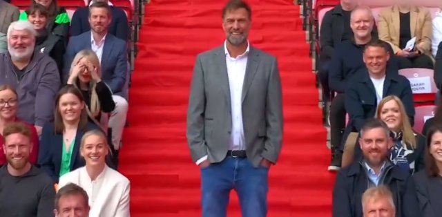 利物浦主帅克洛普与利物浦全体工作人员合影,纪念一起度过的九年时光。 拍摄地点在安菲尔德球场看台,台阶的红毯上陈列着九年间获得的奖杯收起
