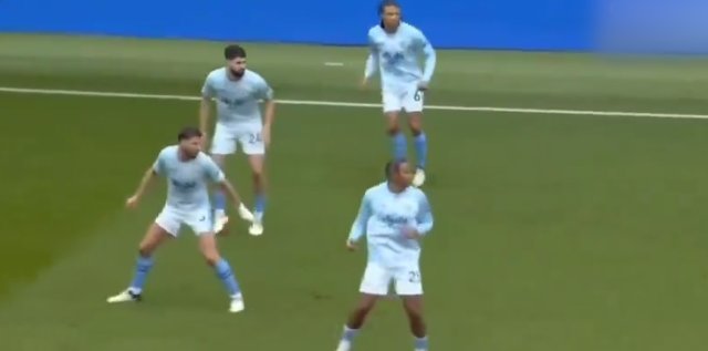 曼城后防线的赛前热身。前压、掩护和平衡,队员需要不断观察整条线的前进和后退,避免防线中出现漏洞收起
