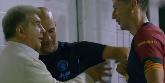 巴萨官推发布球队对阵曼城比赛后花絮,与曼城的友谊赛结束后,拉波尔塔、瓜迪奥拉与莱万聊天,瓜帅掀了一下莱万球衣收起