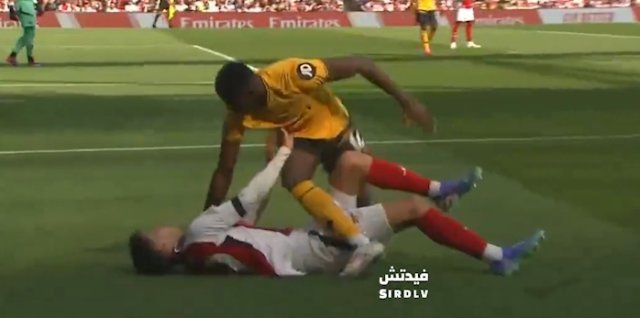 狼队中卫莫斯克拉,先是双手推倒了哈弗茨,再单手压住哈弗茨的脖子,当值主裁没有任何表示收起
