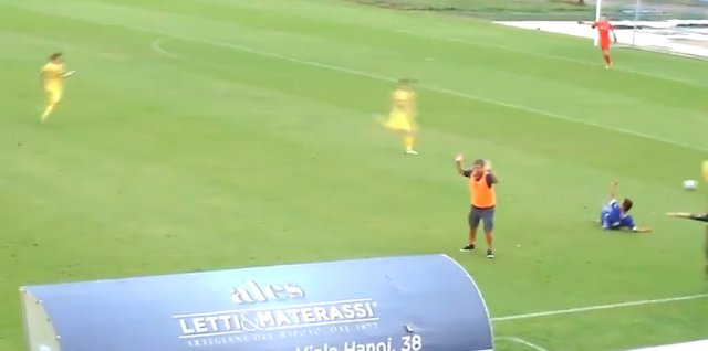 意大利第六级别一场比赛,进攻方准备单刀之时被对方教练放倒,随后教练被红牌罚下收起
