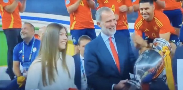 法比安·鲁伊斯把奖杯要来,交给西班牙国王费利佩六世,让国王也过过冠军瘾收起