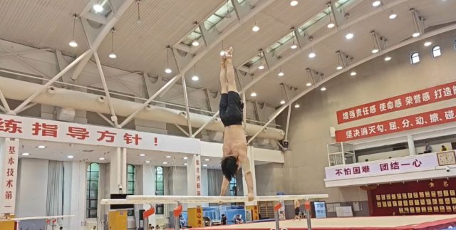 张博恒双杠训练 全力备战巴黎奥运会