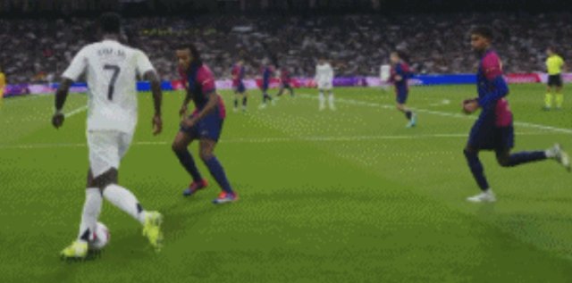 西甲第11轮,皇马vs巴萨。比赛第36分钟,维尼修斯边路试图彩虹过人失败收起