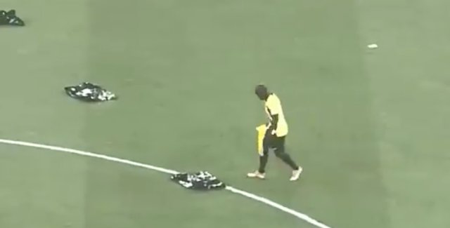 吉达联合球迷在球场上抛掷了数百面黄黑旗,所有球员都去喝水休息时,坎特留在球场上清理旗帜收起