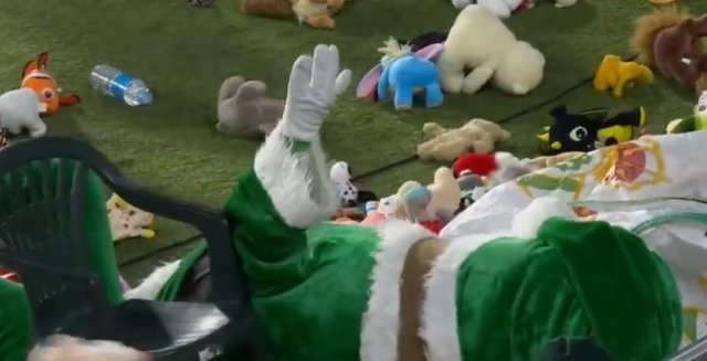 足球界最好的传统之一:皇家贝蒂斯球迷昨晚向球场扔下成千上万个毛绒玩具,这些毛绒玩具会作为圣诞礼物捐给需要这些玩具的贫困儿童, 这是贝蒂斯球迷的圣诞传统收起