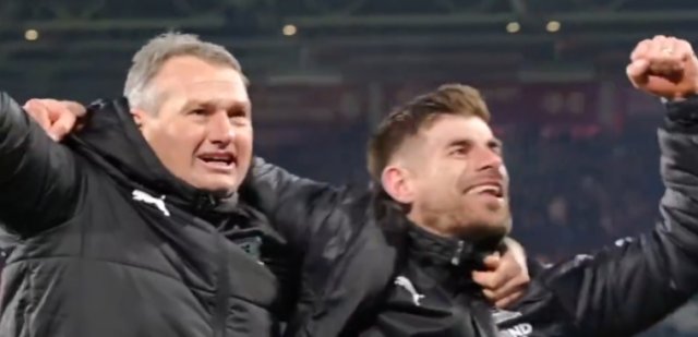 足总杯第3轮,英冠垫底球队普利茅斯客场淘汰布伦特福德,赛后临时主帅南斯基维尔激动的和球员们一起庆祝收起