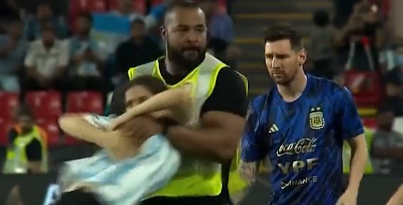 两名女球迷冲进场内快要拥抱到梅西时被保安拦下