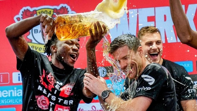 德甲第29轮,勒沃库森主场5比0大胜云达不来梅,提前5轮锁定德甲冠军。赛后发布会,多名勒沃库森球员进入发布会现场,给主帅哈维·阿隆索来了一场“啤酒浴”。收起